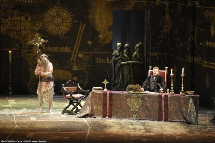 Ya comentamos cuando se estrenó en 2010 que esta producción (montada con los teatros de ópera de Sevilla, Oviedo y Tenerife) que firma Giancarlo del Monaco no funciona con la brillantez que se espera, ni mucho menos. Para esta ocasión se añadía un diseño especial para el acto de Fontainebleau que realmente no aportó nada y que tuvo un movimiento escénico muy deficiente. La escenografía, que firma Carlo Centolavigna, que pretende ser grandiosa se queda la mayoría de las veces muy corta de miras, todos los actos enmarcados por unos paneles móviles que representan una sala renacentista de mapas. Quizá la escena más fallida es la de Atocha donde un inmenso Cristo ocupa todo el escenario limitando el movimiento escénico que por otra parte tiene claras deficiencias (la marcha circular que hace al coro, las idas y venidas de los condenados al auto de fe). Tampoco parece aceptable que en una producción que tiende a representar de forma realista la época del reinado de Felipe II el Gran Inquisidor, máximo representante religioso, se presente ante su rey como un Ecce Homo. También es un lastre la poca agilidad con la que se cambia de una escena a otra, con los consiguientes parones, que en una ópera de la duración de la que comentamos se notan mucho más. En el lado positivo, quizá gracias al impulso de los propios actores, son convincentes la escena de la cárcel y la de los aposentos de Felipe. Espectacular el vestuario de Jesús Ruiz y correcta la iluminación de Wolfgang von Zoubek.