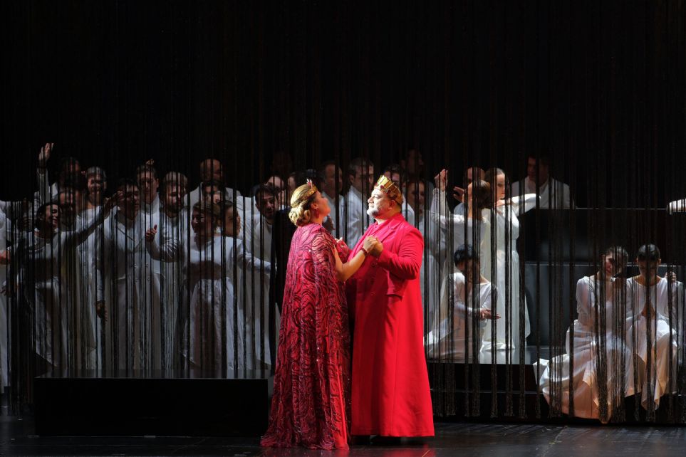 La puesta en escena de Paolo Valerio se pone al servicio, como debe ser, de la recuperación de una obra sepultada en el olvido, sin intentar extrañas ocurrencias, sesudos simbolismos, ni expresiones de ego o búsquedas de protagonismo fuera de lugar. Con proyecciones bien administradas, especialmente las de la partitura de la obra al comienzo de cada escena, escenografía escueta, pero muy funcional, vestuario apropiado y buen trabajo con los artistas, el montaje presenta con coherencia, eficacia, dinamismo y buen ritmo teatral, la trama de la ópera, como debería ser siempre, pero que se revela imprescindible en este caso, que estamos ante un cuasiestreno.