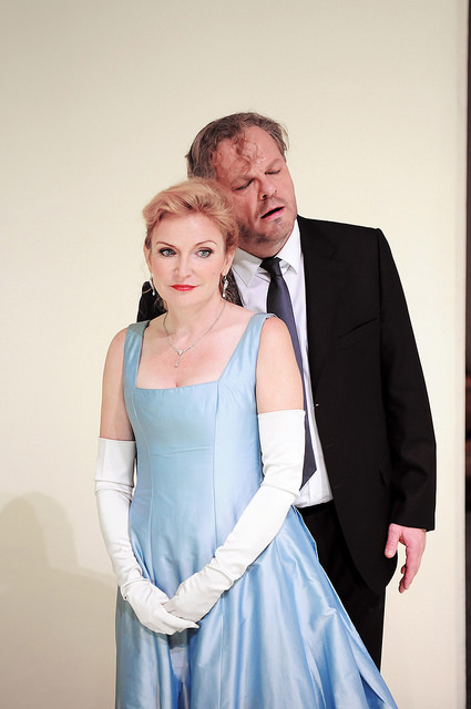 Anne Schwanewilms es una auténtica especialista en un grupo selecto de papeles del repertorio de Wagner (Elsa en Lohengrin y Elisabeth en Tannhauser) y Strauss (Mariscala de Rosenkavalier, Emperatriz en Die Frau ohne Schatten, el rol titular de Ariadne auf Naxos, Chrysothemis en Elektra y esta Arabella que nos ocupa). Como ya dijéramos al hilo de su Elsa en Lohengrin en el Teatro Real, hay en su arte una genial contradicción. Y es que consigue llegar muy lejos precisamente desde un arte hecho de contención actoral y austeridad vocal, administrando sus medios, ideales para este partitura, con sutileza y elegancia, sin el menor exceso, siempre musical y poética, refinada y un punto estoica, como atemporal. Y así, poco a poco va desgranando Schwanewilms el carácter de Arabella, bien medido y construido con una inteligencia digna de elogio. Doble mérito el suyo, por cierto, al actuar aquejada por las molestias de un esguince de tobillo sufrido durante los últimos ensayos de esta producción.