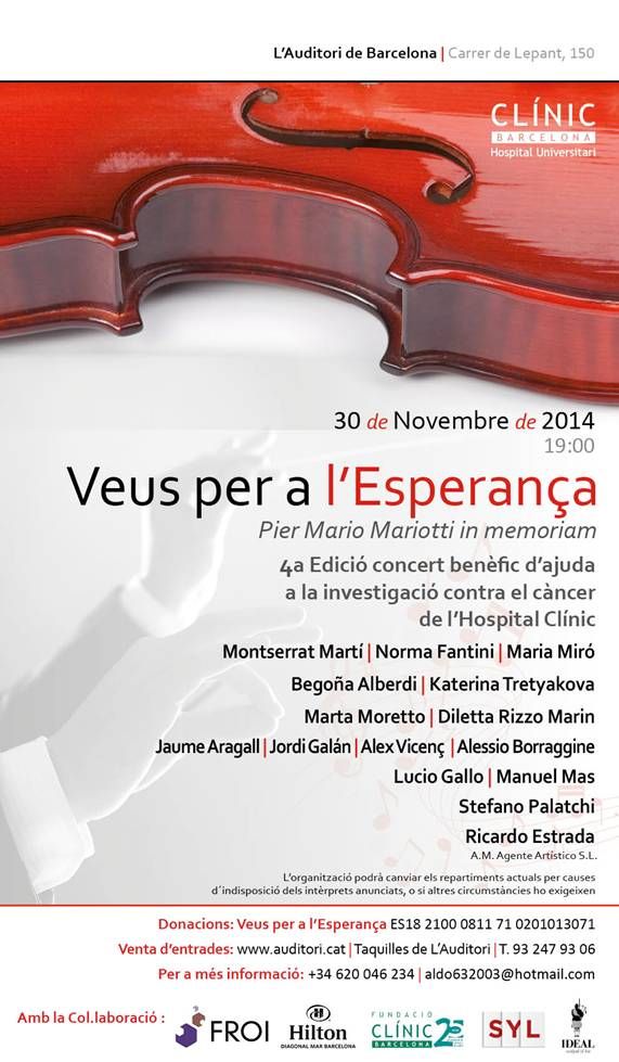 Este próximo domingo 30 de noviembre, a las 19 horas, tendrá lugar la gala lírica “Veus per a l’Esperança” en L´Auditori de Barcelona. Será la cuarta edición de un concierto benéfico cuyo objetivo es recaudar fondos para ayudar a la investigación contra el cáncer en el Hospital Clínic de Barcelona. En la edición de este año colaboran las sopranos Norma Fantini, Montserrat Martí, Maria Miró, Begoña Alberdi y Katerina Tretyakova; las mezzosopranos Diletta Rizzo Marin y Marta Moretto; los tenores Jaume Aragall, Jordi Galán, Alex Vicenç y Alessio Borragine; los barítonos Lucio Gallo y Manuel Mas; y el bajo Stefano Palatchi, todos ellos acompañados al piano por Ricardo Estrada. En el programa, arias y canciones de Verdi, Puccini, Rossini, Donizetti o Tchaikovsky, entre otros. La recaudación obtenida se destinará a reforzar tres líneas de investigación contra el cáncer del Laboratorio en Oncología Molecular y Traslacional del Clínic-IDIBAPS que lidera el Dr. Pere Gascón: el papel de la célula madre tumoral en la respuesta a los tratamientos; el papel de la heterogeneïdad tumoral en la resistencia a los tratamientos; la Influencia de la inflamación en procesos cancerosos: papel de los neuropéptidos. Además de las localidades para el concierto, se puede contribuir a la causa a través de una fila cero en la web de micromecenazgo Migranodearena. Pueden realizarse asimismo donaciones directas a la cuenta de La Caixa creada a nombre de “Veus per a l’Esperança” con el número: ES18 2100 0811 71 0201013071.