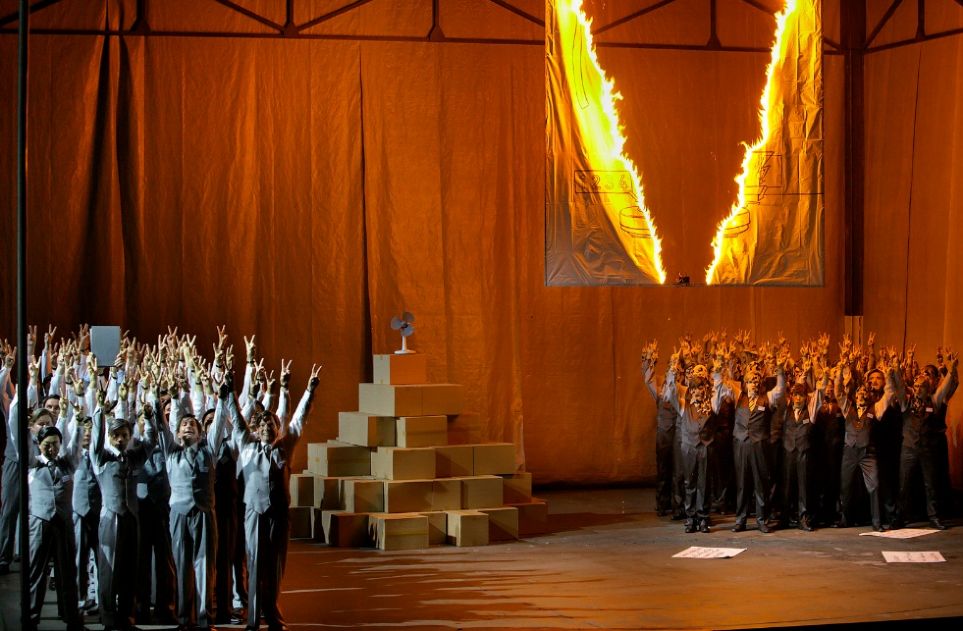 Jan Philipp Gloger ofrece la habitual propuesta escénica alemana, esto es, conceptual y desmitificadora si bien, al menos en esta ocasión, trazada con con cierta coherencia interna. El holandés no es marinero pero en cualquier caso es un viajero sin rumbo (aparece desde la oscuridad con una maleta sobre ruedas como si acabara de salir de una terminal aeroportuaria) y desde luego su fortuna no satisface sus deseos más profundos como ser humano por más que pueda comprar favores sexuales o financieros, tal y como comprobamos desde la obertura. Daland es un avispado empresario que regenta una mediana empresa de ventiladores (olvidémonos de las hilanderas) y que, con cierta vista comercial, al final y a la vista de las circunstancias reconvierte su empresa en una factoría de figuritas de la pareja enamorada y, a la postre, autoinmolada. A nivel estético por supuesto no encontramos mares, ni barcos, ni marineros, ni siquiera retrato que obnubile a Senta: en cambio sí hay multitud de tópicos "modernos" como trajes de chaqueta, maletas de último diseño, luces leds, proyecciones videográficas...