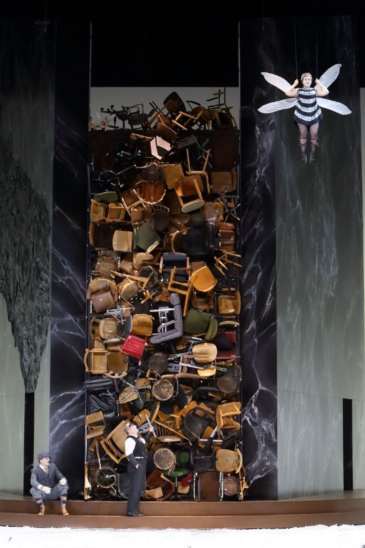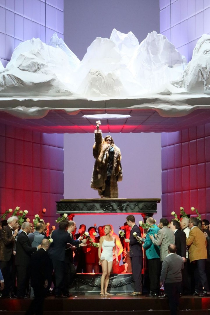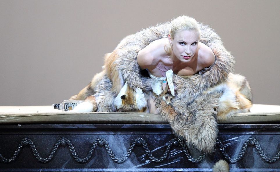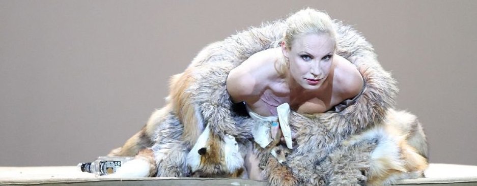 La Bayerische Staatsoper de Múnich ha previsto estrenar este año cinco nuevas producciones (El caso Makropulos, Manon Lescaut, Lucia di Lammermoor, Lulu, Pélleas et Mélisande). De entre todas ellas, una de las más atractivas era la prevista para este Caso Makropulos de Janacek que nos ocupa. Firmaba la producción, Árpád Schilling, responsable también de un irregular Rigoletto que se repone de tanto en tanto en Múnich. El resultado de su propuesta es una producción fotogénica, sí, pero superficial, sin genuina trascendencia. Hay un gran trabajo estético, qué duda cabe, sobre todo por cuanto hace al retrato de la protagonista, a través sobre todo del esmerado vestuario que firma Márton Ágh, responsable asimismo de un decorado circular, donde se alternan algunos cuadros tediosos con otros francamente atractivos, como ese enrejado de sillas que vemos al comienzo, como ilustrando el relato kafkiano de una burocracia sobredimensionada y cruel. El resultado final, en todo caso, es una producción pretenciosa, como si quisiera situarse en la estela de un Warlikowski pero sin todo aquello que hace brillante el trabajo de Warlikowski, de quien pudimos ver precisamente un Caso Makropulos en París.