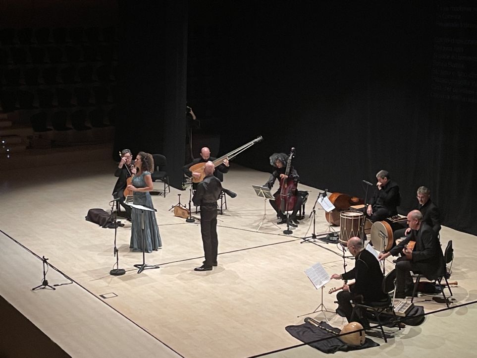 El conjunto de ambos brilló en lo escénico y en lo vocal, por la diversidad de acentos del pentagrama en la Villanella, In Toledo y también los del texto en la Cançona del paradiso e dell’inferno. La soprano, acompañada de la citarina, de regusto atmosférico en su sonoridad de brillo aéreo, referenciaba la angelicalidad sutil y bienaventurada. Por su parte el tenor (digámoslo así por el color de la emisión central de su voz, también libre de impostación) protagonizó una infernalidad, un punto caricaturesca, con ciertas jocosidades gestuales bien conceptualizadas y con la intención de su fraseo, más recitado que cantado.