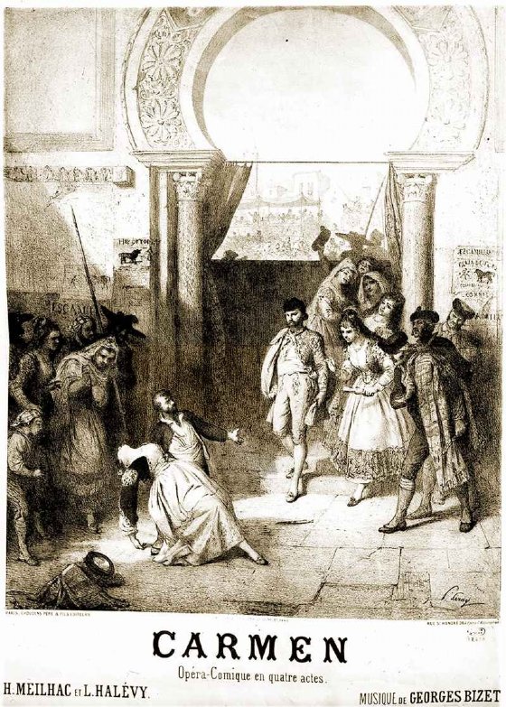 En 1873, De Leuven y Du Locle, los dos directores de la Opéra Comique, encargaron a Bizet la composición de una ópera con libreto de Meilhac y Halévy. Bizet sugirió como tema la novela de Prosper Merimée, Carmen, escrita en 1845. A pesar del entusiasmo de los libretistas, De Leuven no estaba de acuerdo con el tema. La Opéra Comique era principalmente un teatro de entretenimiento familiar y Carmen presentaba escenas evidentemente violentas, como la muerte final de la protagonista en el escenario. De Leuven renunció a su cargo en 1874 y el proyecto pudo seguir adelante, pero éste no sería el único obstáculo que tendría que sortear Bizet para poder estrenar su ópera. Los ensayos se alargaron mucho más de lo previsto debido a las quejas de la orquesta, que opinaba que algunos fragmentos eran imposibles de tocar. El coro también se mostró indignado al ver que se pretendía que actuaran individualmente, especialmente las mujeres, que tenían que fumar y pelear en escena mientras cantaban.