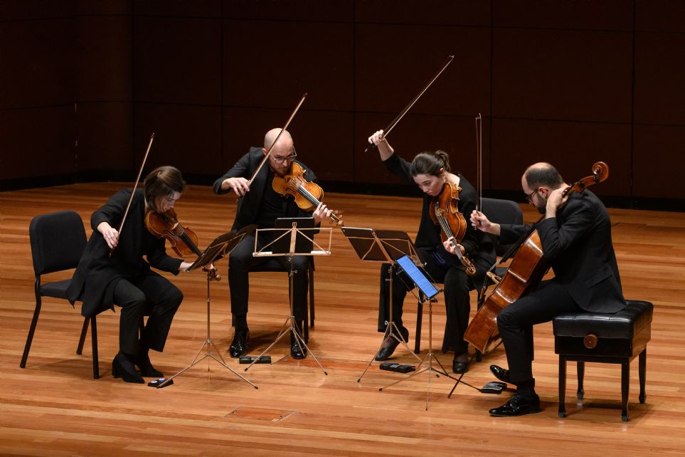 Madrid, 6-II-2023, Auditorio 400 del Museo Nacional Centro de Arte Reina Sofía. Series 20/21, Centro Nacional de Difusión Musical. Cuarteto de cuerdas n.º 3 «Raging in the dark» y Cuarteto de cuerda n.º 4 «Widmung», de Benet Casablancas; Cuarteto de cuerdas n.º 15 en si bemol menor, op. 144, de Dmitri Shostakovich. Cuarteto Cosmos: Bernat Prat y Helena Satué [violines], Lara Fernández [viola], Oriol Prat [violonchelo].