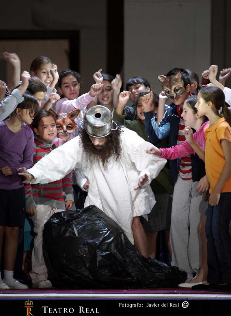 Al final de la escena de la catedral de San Basilio y la escena en Kromi, el idiota canta: "Pronto la oscuridad caerá. Negra oscuridad, tinieblas insondables. ¡Ay, ay Rusia! ¡Llora, pueblo ruso, pueblo hambriento!" El idiota es el único personaje que aparece en todos los niveles narrativos y los une. Entra en contacto con el pueblo, con Boris y es testigo de la llegada de Dimitri en el bosque de Kromi, al final de la obra. Su canto da un tono pesimista a toda la obra. Los gobernantes van y vienen, mientras que las penas del pueblo ruso permanecen. La situación del pueblo que soporta la carga de la política, no cambia apenas. Desde el inicio de la ópera vemos un pueblo oprimido y pobre. Al contrario que en la obra de Pushkin, al principio se habla de una opresión violenta por parte de un Estado policial. En la escena de la catedral de San Basilio nos encontramos al mismo pueblo, pero su situación ha empeorado aún más. En la escena en Kromi somos testigos de una revuelta, pero las palabras del idiota parecen relativizar su impacto. La historia real le dará la razón: el falso Dimitri no contribuyó a mejorar las condiciones del pueblo y fue asesinado, y lo mismo le sucedió a Chuiski después. El idiota es un personaje complejo. Su comportamiento se sitúa entre dos extremos, por un lado muestra una ingenuidad infantil y por otro lado es capaz de provocar y denunciar y hace gala de una sabiduría profunda. Es el único que se atreve a cuestionar a Boris públicamente. A pesar de su marginalidad, el idiota jurodivyj desempeña un papel central en la ópera. El personaje es totalmente ruso con sus raíces cristianas, bizantinas, gnósticas y hasta chamánicas. El jurodivyj histórico se solía encontrar en las escaleras de la iglesia, en el umbral entre el poder mundano y la fe, entre el mundo real y el más allá. El pueblo le respetaba y él solía hacer lo contrario de lo que esperaban las normas oficiales. A menudo iba desnudo en vez de vestido; se mantenía callado, balbuceaba o lloraba en vez de hablar; trataba con niños en vez de adultos. A partir de la teatralidad de su protesta pública surgió una especie de ‘espectáculo' religioso. Hablaba del paraíso. Su comportamiento extraño tenía un papel didáctico para el pueblo, porque desenmascaraba las mentiras del mundo real. También era el personaje que con sus actos señalaba al pueblo el contraste entre la realidad amarga y el paraíso prometido. El idiota aparece tanto en la escena de San Basilio de la primera versión, como en la escena en Kromi de la segunda versión. La combinación de las dos versiones de Musorgski nos permite situar al idiota una vez en medio del pueblo hambriento y desesperado y luego en medio del tumulto revolucionario, utilizando el mismo texto y la misma música en ambas escenas. Eso nos brinda la oportunidad de mostrar la ruptura ideológica entre ambas versiones. En el punto álgido de la escena de la revolución el pueblo canta "Desechamos nuestras cadenas, liberamos al pueblo. [...] Pueblo ruso, acaba con tu vida en la pobreza y lucha por la libertad. [...] Expulsaremos a la tiranía y acabaremos con la miseria. [...]". Al unir el coro completo se consigue el efecto que Slavoj Žižek llama "el anonimato liberador". El filósofo esloveno utilizó esa expresión en relación a las máscaras utilizadas por el grupo de punk ruso Pussy Riot. Ese grupo provocador no actuó como individuos contra Putin en la catedral de Cristo el Salvador de Moscú en febrero de 2012, sino que gracias a sus máscaras representaban una idea. Por eso las autoridades políticas y religiosas de Rusia las consideran tan peligrosas. A un individuo le puedes encarcelar, a una idea no. En nuestros tiempos, en los que surgen revueltas y protestas en todo el mundo, los coros cautivadores de Musorgski de la escena en Kromi nos suenan muy actuales. La energía revolucionaria de esta música no se desvanece del todo al final de la ópera con el canto del idiota. ¿Seguirá todo igual al final de Boris Godunov como sugiere el idiota? ¿De veras es imposible romper el ciclo histórico? ¿Es inútil la protesta? ¿Se puede volver sin más a la situación anterior después de una revuelta? Durante los ensayos de este Boris Godunov, Johan Simons dijo en varias ocasiones: "Si no te dan oportunidades, cógelas". La última nota de la imagen revolucionaria de Musorgski en el bosque de Kromi quedará en el aire.