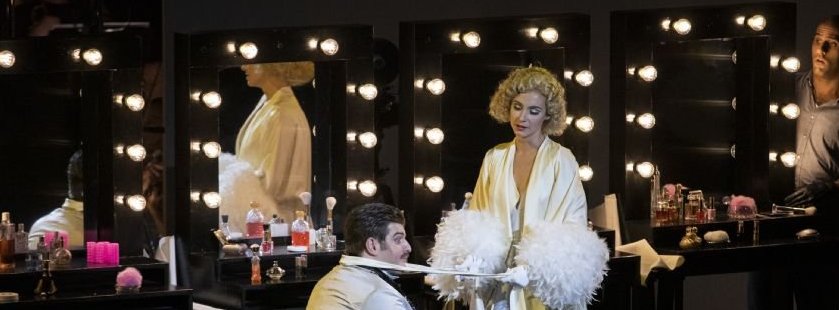 El espectáculo es una coproducción del Teatro Comunale con el Auditorio de Tenerife y el Teatro de la Opera y del Balet de Tbilisi, Georgia, en el marco del proyecto Opera (E)studio financiado por el programa EU Creative Europe. En Bolonia se propone en el marco de «Opera Next, sección de la temporada, vinculada a actividades de alta formación. El director general del Teatro Comunale, Fulvio Macciardi ha optado por recurrir al espacio del palacio de deportes PalaDozza también para la ópera, apostando por la posibilidad de ofrecer un espectáculo en vivo respetando las medidas de seguridad de distanciamiento no solo entre el público sino también entre los trabajadores del teatro. Por ello el espectáculo se ha realizado de manera semi-escénica con la orquesta al fondo, el coro a la derecha y los cantantes sobre una tarima central. Estos últimos se movían, con el acertado vestuario de Lorena Marín, en la móvil escenografía de Serena Rocco, iluminada por Virginio Levrio y adaptada a la propuesta del director Pablo Maritano, que nos traslada a un plató de cine porque ve el amor como una ficción de guión cinematográfico.