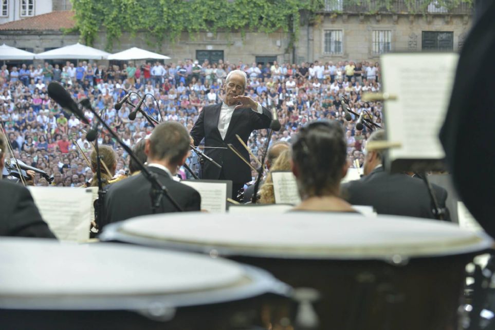 Y atendiendo al ambiente de júbilo que impregna las rúas compostelanas, a punto de clausurar las Fiestas del Apóstol, la Real Filharmonía salió del Auditorio de Galicia para tomar la Plaza de la Quintana. ¡En qué poco espacio cabe tanta historia! La catedral con su Puerta Santa, fin último de tantos y tantos peregrinos que acuden a Compostela; enfrente, el monasterio de San Paio de Antealtares (s. IX); la magnánima Berenguela que no contuvo sus campanas como una más de la orquesta (s. XIV); o las barrocas Casa de la Conga y Casa de la Parra. Para completar el conjunto, un repertorio romántico y una orquesta contemporánea, que todavía festeja sus 20 años.