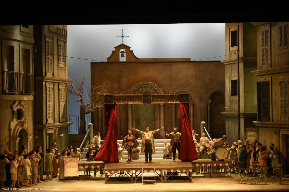 No es raro que cuando se pone en escena estas dos óperas haya nexos de unión entre ellas en la producción. La que presenta Joan Anton Rechi para esta nueva puesta de ABAO ahonda en este camino. E incluso va más allá utilizando un acertado nexo dramático entre las dos piezas que no voy a revelar para que sea una sorpresa para los que acudan al Euskalduna en próximas representaciones. No es el único acierto de Rechi. La escenografía (de Gabriele Moreschi) es de corte clásico y realista (toda la producción, incluido vestuario, nos lleva a la Italia de mediados del S. XX y nos recuerda al neorealismo cinematográfico). Se nota que es una producción creada para el Euskalduna (y que ha pensado en público y cantantes) porque cuida dos detalles. Uno el cerrar el escenario (se crea una típica plaza de un pueblo del sur italiano cuyo fondo es una escalinata y una iglesia) lo que lleva a que las voces no se pierdan ni en laterales ni fondo y se proyecten hacia el amplio auditorio sin pérdidas sonoras. Y el otro hacer que los personajes canten casi siempre en el tercio delantero del escenario, en el proscenio, para que el esfuerzo para traspasar la orquesta y llegar a todos los rincones del Euskalduna sea menor. En Pagliacci la escenografía se completa con un antiguo carromato circense que aparca en la plaza del pueblo. Ayudado, seguramente, por unos cantantes colaboradores y un coro entusiasta, el movimiento escénico casi siempre es acertado y con el ajustado dramatismo. Sólo habría que perfilar mejor los movimientos de un coro a veces excesivamente deambulante. La iluminación, responsabilidad de Bogumil Palewicz, se centra adecuadamente en marcar los momentos dramáticos y el vestuario de Mercè Paloma se ajusta perfectamente a ese aire neorealista que se comentaba más arriba.Muy acertados también detalles que pueden pasar desapercibidos pero que dotan de un hilo conductor lógico a la historia y que a la vez la clarifican, como fue el juego con el anillo de compromiso que supuestamente da Turiddu a Santuzza y que simboliza la palabra dada por el amante infiel. También el cambio de el reto al duelo entre Alfio y Turiddu que en la omertà siciliana (y en la representación original) se simboliza con un mordisco en el lóbulo de la oreja y que Rechi sustituye por el mordisco de ambos hombres a una manzana. En resumen, una producción que se adapta perfectamente a un espacio tan traidor como el Euskalduna y que se ajusta, con buen criterio, al gusto del público de ABAO.