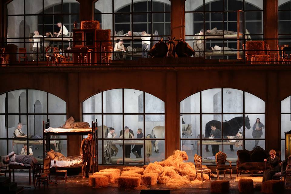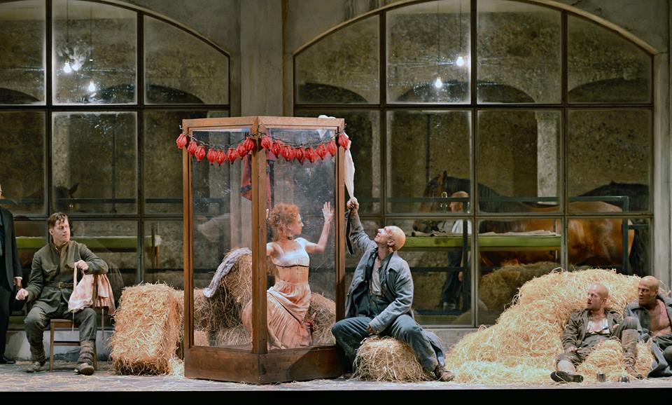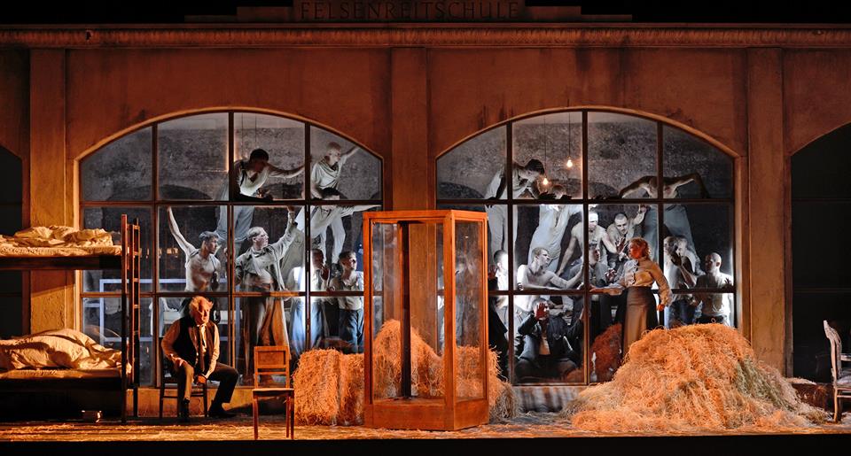 Esta producción de Alvis Hermannis, originalmente estrenada en la Grossesfestspielhaus de Salzburgo, pierde buena parte si no todo su interés al trasladarse al espacio escénico de la Scala, donde la referencia a la Felschenreitschule que preside la escenografía deja de tener sentido. Asimismo, la producción transmuta su eje escenográfico, originalmente pensada como un extenso fresco en horizontal ocupando la gran escena de Salzburgo, para satisfacer ese requerimiento de escenas simultáneas en distintos espacios y tiempos. Al contrario, el trabajo se muestra aquí en vertical, organizada la escenografía en dos alturas, perdiendo con ello casi toda su fuerza visual, al quedar asimismo la percusión dispuesta, y oculta, a lo largo de los palcos de proscenio, en lugar ser visible en continuidad con la escena, como sí sucedía en Salzburgo. El resultado es una producción a todas luces venida a menos desde su estreno en Salzburgo, con una escenografía un tanto desaprovechada, que ha perdido su espectacularidad y con una representación que no epata ni sobrecoge, por mucho que tenga momentos puntales de fuerza. El trabajo de Hermanis es así de algún modo menos potente que la propia obra, quedando como un enfoque un tanto conformista y taimado, anclado en una literalidad que no termina de levantar el vuelo y deja en el espectador una cierta sensación de frialdad, cuando en la naturaleza de la obra está más bien el espíritu de conducir al espectador hacia territorios extremos, hacia experiencias y sensaciones lindantes esa difusa línea roja en la que se enmarca lo que somos capaces de soportar en un teatro.