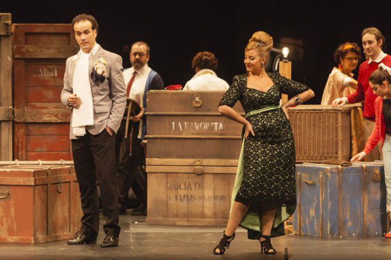 En El dúo de “La africana” se representa a una compañía de ópera de tres al cuarto que sobrevive gracias a la avara actitud de su empresario Querubini, que reutiliza vestuarios de funciones pasadas y no paga a sus artistas, en su mayoría familiares, tolerando incluso el escarceo entre su propia esposa, La Antonelli, tiple de la compañía, y el tenor Giuseppini, ya que canta “por amor al arte” y, claro, “non le paga”. Resulta superflua la inclusión en esta versión de dos sastras, que no hacen sino interrumpir el desarrollo de la acción y los diálogos de los personajes e incluso impidieron escuchar claramente el bello preludio de la obra con sus continuos y superfluos parloteos. Se les ha asignado además a estos dos personajes parte del papel que en realidad debería ejecutar Pérez, el regidor de la compañía, que en esta ocasión no abrió la boca en toda la obra más que para interpretar su número con el coro, donde ciertamente Lander Iglesias tuvo problemas para sincronizarse con la orquesta, yendo a destiempo durante toda su breve intervención.