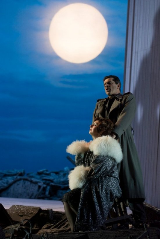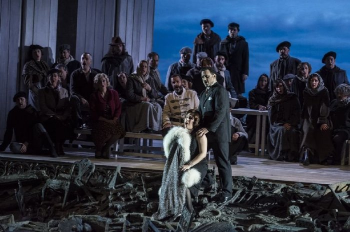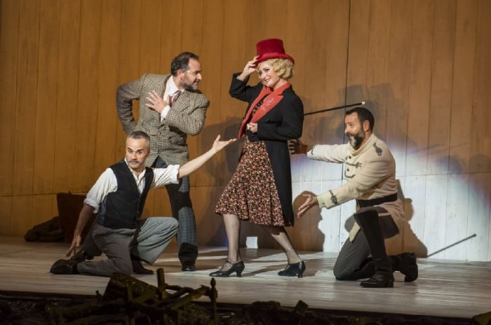 El futuro de la zarzuela pasa sin duda por un bien entendido amor propio. La riqueza del género requiere de apuestas bien medidas si quiere ganar un futuro de normalidad y estabilidad, con un público renovado. En este sentido el trabajo de Emilio Sagi con esta Katiuska estrenada hace seis años en Bilbao es ejemplar. Su mano se percibe no sólo en la propuesta escénica como tal sino asimismo en la versión que se muestra, debidamente recortada (quizá en exceso, es cierto) hasta conformar un espectáculo de poco más de una hora y cuarto, sin mediar descanso. El espectáculo resultante es ágil, divertido y subraya sin afección los momentos de más inspirado lirismo que aguardan en la partitura, en una transición cómoda desde éstos a las páginas con un tono más “revistero”, como el número de cabaret en “A París me voy” o el vals de los cosacos. Daniel Bianco, a la sazón el nuevo director artístico del Teatro de la Zarzuela, dispone el trabajo de Sagi sobre una escenografía funcional y vistosa, aunque levemente incómoda para los solistas, con esa perspectiva inclinada y esa suerte de ruinas al pie del escenario.