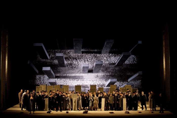 La producción escénica de Daniele Abbado, que ya habíamos comentado al hilo del debut de Plácido Domingo como Nabucco en Londres, es un quiero y no puedo. Y es que tomarse en serio una actualización del drama histórico del pueblo hebreo exige hoy en día meterse en camisas de once varas y Abbado no demuestra ni capacidad ni valor para ello, limitándose las más de las veces a un trabajo superficial y complaciente hecho de gabardinas grises y unos monolitos que son un eco vago y remoto del impresionante monumento berlinés a las víctimas del Holocausto que se yergue a pocos pasos de la Puerta de Brandeburgo, si bien reducido aquí a una caricatura de si mismo. Amén de unas proyecciones banales, la propuesta la rematan una suerte de ridículos ninots vagamente inspirados en el mejor hace de La Fura y que hacen aquí de ídolos paganos. Si este es el Nabucco que quieren teatros de la talla del Liceo, el Covent Garden, la Scala o la Lyric Opera de Chicago, me temo que tenemos un problema.