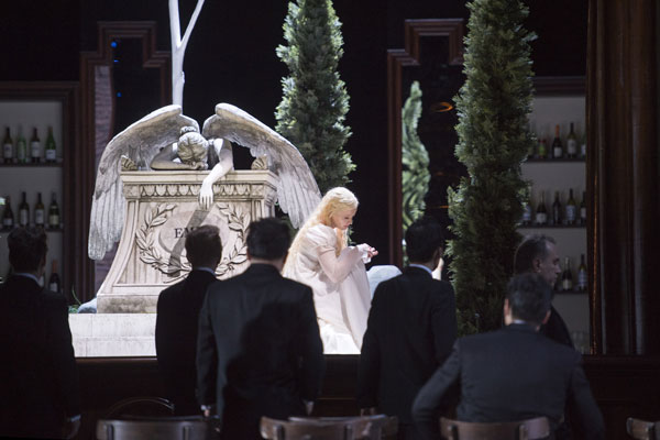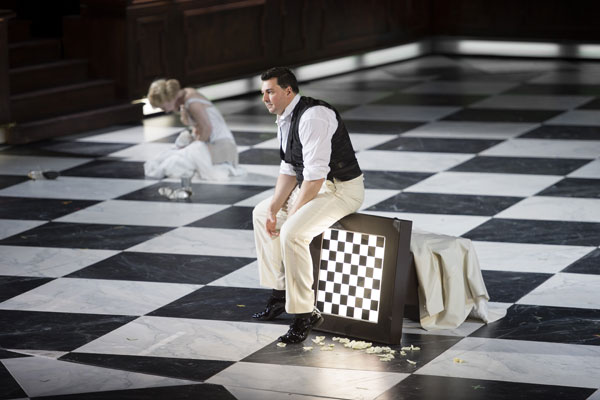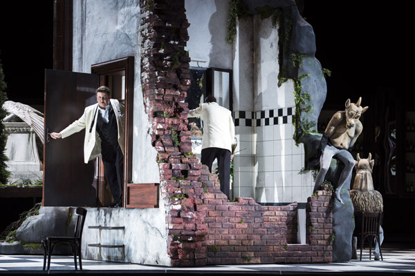 La nueva producción de Johannes Erath para la Ópera de Frankfurt, con dramaturgia de Zsolt Horpácsy, se apoya en una estupenda escenografía de Heike Scheele. Estamos ante un trabajo de corte clásico pero primorosamente realizado y puesto al día, con una gran carga poética y una minuciosa dirección de actores. No es fácil bregarse con el imposible libreto de la obra, cuya ación no se presta apenas a elaboraciones con mayores implicaciones. Erath consigue hacer justicia a la obra, a su música más específicamente, disponiendo en escena un espectáculo elaborado y nítido, con la virtud principal de resultar narrativo, facilitando la comprensión de una obra infrecuente.