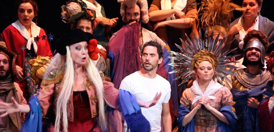 De este modo, sobre el escenario vemos un desfile de personajes de la época en que se estrenaron las obras junto con los actuales. El Pablo Iglesias de entonces, líder del recien creado Partido Socialista que luchaba contra la alternancia en el poder de Conservadores y liberales, personificados en Cánovas y Sagasta (también presentes), y al Pablo Iglesias de ahora en plena crisis del bipartidismo que ha protagonizado la vida española democrática de los últimos años. También la indignación ante la deuda pública que no deja de crecer, los planes y obras megalómanas que no acaban nunca, y esos malos gobernantes, además de corruptos, que han asolado el país. Los “pelotazos” de antes son parecidos a los de ahora. Impagable ver la fabulosa Jota de los ratas (que mereciera en su dia los elogios de Nietzsche) cantada por trasuntos de Bárcenas, Pujol y Fabra sobre imágenes de Isabel Pantoja, Julián Muñoz, Rodrigo Rato… Asimismo, es importante resaltar esa presencia de la intelectualidad encarnada por Valle Inclán, Machado, Benavente, Galdós, Baroja, siempre preocupados por los problemas y la idea de España y que no podían imaginar que aún podrían ir peor las cosas para el país llegándose a una lucha fratricida. También comparece Barbieri, figura fundamental de nuestra zarzuela, cofundador del Teatro de la Zarzuela y uno de los grandes músicos que ha dado España, defendiendo la legitimidad del concepto del teatro como puro entretenimiento. Como se subrayaba anteriormente, el montaje progresa ágil, provoca carcajadas y la mayoría de las situaciones, descaradas e irreverentes, están bien trabajadas y resultan eficazmente cómicas, a pesar de alguna que otra no tan lograda y alguna provocativa en que se practica una felación a un sacerdote, que provocó airadas protestas de algunos espectadores que abandonaron la sala.