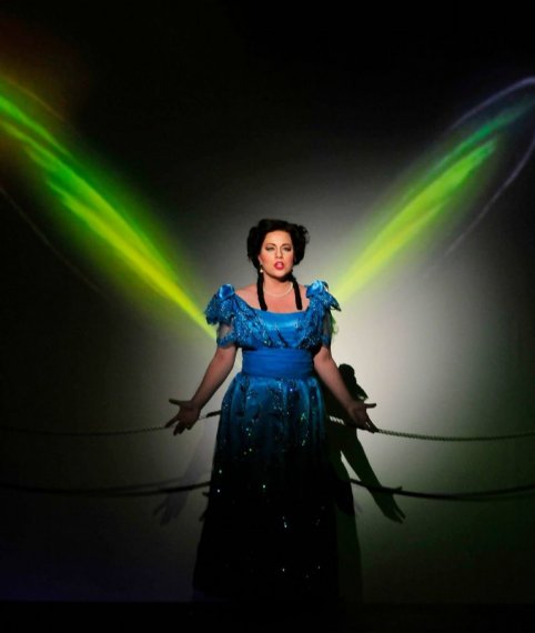 La producción, estrenada el año pasado en la Ópera de Nashville, nos presenta un escenario enmarcado en un enorme cuadro rectangular con dibujos clásicos de la Casa Ricordi, probablemente de Adolf Hohenstein. El fondo se utiliza a modo de telón posterior donde se proyectan las imágenes. Las tablas nos marcan la cubierta del barco, mientras que en la parte delantera, un grupo de bailarines vestidos de blanco están permanentemente sobre el suelo del escenario moviéndose sinuosamente sin parar. El efecto conseguido es de movimiento continuo. La dirección de actores da poco juego, y las proyecciones de video de Barry Steele son adecuadas en la descripción del viaje, pero se convierten en caricaturescas en las escenas simbólicas, sobre todo en la escena final, donde Florencia se convierte en mariposa y vuela al encuentro de su amado Gerardo, cual Campanilla en la película de Walt Disney.