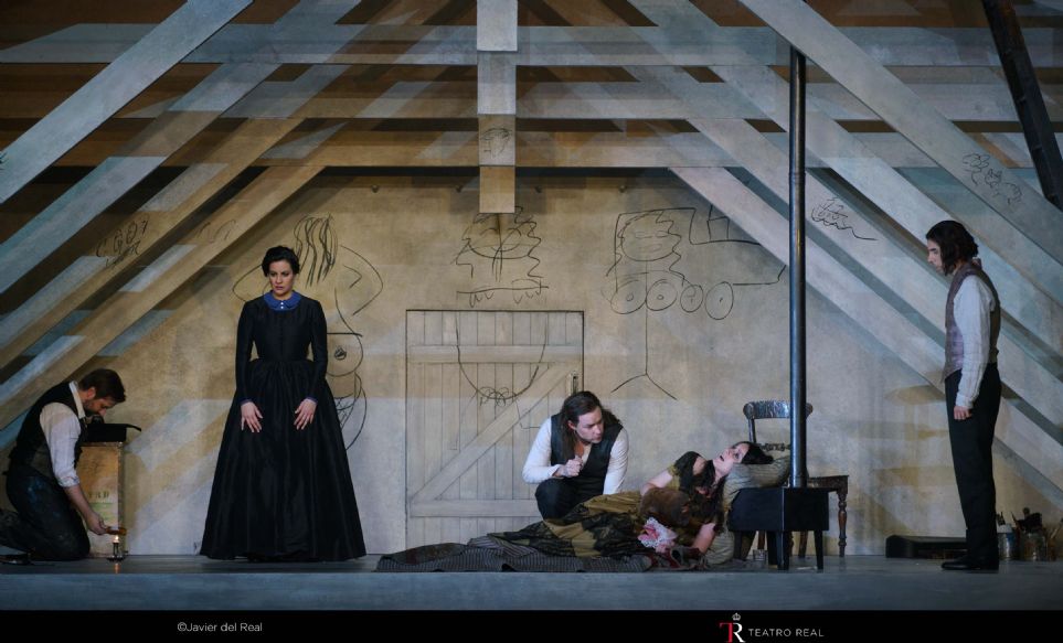 Reflexión también para analizar, que un tenor como Stephen Costello que ya dejó una paupérrima interpretación del Duque de Mantua de Rigoletto en el propio Teatro Real (con abucheos incluidos en más de una función), se le premie nada menos que con el Rodolfo de La Bohéme. Cosas de la lírica actual. De este modo, el público capitalino tuvo que volver a soportar esa insulsa vocecita desimpostada, ese pasaje sin resolver, esa falta de los mínimos rudimentos técnicos, esa ensalada de sonidos caídos, calantes, desapoyados… Con este bagaje técnico, no puede extrañar que ya en el primer acto concurrieran los incidentes en forma de gallos. Los alaridos en la zona alta estuvieron bien representados por un infame Do sobreagudo de un “Che gelida mannina” mortecino, en el que apreciar un fraseo escolar sería muy generoso. Pocas veces ha interesado menos el relato de Rodolfo, que en la voz de Costello. Ni acentos, ni calor, ni rastro de la passionalità pucciniana, ni efusión, ni seducción tímbrica, ni comunicatividad… Que una de las grandes escenas de la historia de la ópera, como es el final del acto primero desde que entra Mimì en la buhardilla, pasara sin pena ni gloria deja muy a las claras los derroteros por los que transcurrió la representación. Efectivamente, la soprano rumana Anita Hartig tampoco justificó la cierta fama de la que venía precedida. De hecho, era la “diva” entre los cantantes anunciados en las dos distribuciones teniendo en cuenta que ha sido Mimì en Viena, Nueva York, Londres… Es innegable que la voz, compacta y bien armada, se proyectó bien por toda la sala, pero ni el timbre es bello, ni todo lo flexible que uno desearía. Además, el sonido por encima del pasaje se agria, con unas notas agudas abiertas y chillonas. El canto es correcto, pero inexpresivo, sin calor alguno, sin acentos, en una Mimì sin carisma, que no logra cautivar lo más mínimo. Y así se sucedieron momentos como “Addio senza rancor” o “Sono andati?” (Puccini es tan grande que es imposible que uno no se estremezca a partir de este momento esté quién esté sobre el escenario) cantados de manera tan correcta como plana y distante. La presencia de una soprano como Joyce El-Khouri en el papel de Musetta también tiene que ver, sin duda, con los juegos de agentes y demás tejemanejes, por cuanto uno está seguro, que en cualquier conservatorio nacional se podrían encontrar muchachas que chirríen menos y emitan sonidos más agradables al oído que esta soprano Líbano-canadiense a quien se ha ido a buscar tan lejos. Bueno, sin embargo, el Marcello de Etienne Dupuis, una voz bien colocada, homogénea y de grato calor, en un cantante de templada línea canora. Lástima, que más allá de la emisión intestinal de Mika Cares en su Colline y la modestia tímbrica de Joan Martín Royo como Schaunard, no hubiera química alguna en el grupo de bohemios, que no lograron que el público se identificara con su alegría de vivir, su despreocupación, y disfrute de la vida a pesar de la pobreza en que se encuentran. Esa felicidad que resulta tan efímera, como lo es la juventud y la inocencia y que viene a arrancar de manera cruel la tragedia que supone la muerte de Mimì en la flor de la vida. En fin, un José Manuel Zapata consumido vocalmente, tampoco pudo aprovechar la faceta escénica, de comediante, dado que la mayor parte de su intervención se produjo de espaldas al público.