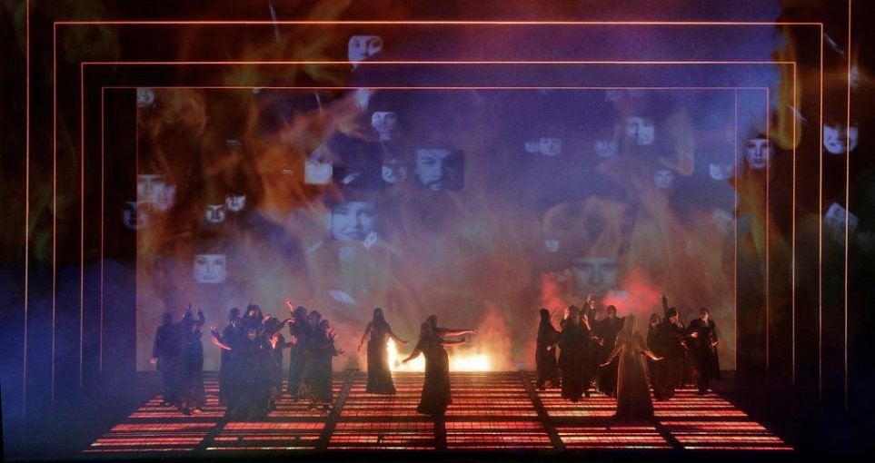 De nuevo la puesta en escena de Francesca Zambello es visualmente impresionante y ofrece escenas de gran impacto dramático. No solo la ya mencionada, sino también la crucial inmolación final, llevada a cabo con la espectacularidad demandada. Zambello opta por acabar el ciclo incidiendo en el mensaje de renovación y esperanza: una niña entra en escena durante la coda final y planta un retoño que se convertirá en el nuevo Fresno del mundo. Se completa así una producción muy estimable, visualmente impecable y que ambienta bien cada escena, además de transmitir bien su mensaje central sobre la ruptura de un pacto con la Naturaleza y las cataclísmicas consecuencias que ello conlleva. Sin embargo, como he comentado en anteriores entregas, otros mensajes secundarios no llegan a cuajar e incluso llegan a perjudicar el flujo narrativo. En este Ocaso la sociedad de los guibichungos se muestra como violentamente misógina y sus mujeres se toman su venganza al final, matando a Hagen. La escena en sí funciona pero al mismo tiempo parece fuera de lugar. Asimismo, a lo largo del Anillo parecen hacerse alusiones a la historia estadounidense, pero no de manera suficientemente clara como para realmente aportar algo. Como ejemplo, en el medio de la espectacular escena de las valquirias paracaidistas de Die Walküre, los guerreros que transportan son fotografías en gran formato de soldados caídos en las principales guerras de los EE.UU. Este homenaje no casa con el tono general más desenfadado del resto de la producción y de la escena en particular. La dirección de actores también pecó de poco detallista y los movimientos escénicos en ocasiones fueron discutibles —cantantes no agraciados con grandísimas voces se vieron obligados a desgañitarse desde posiciones complicadas—. Tenemos, en el cómputo global, una interesante y visual producción del Anillo, a la que le falta algo más de pulso dramático para ser verdaderamente redonda.