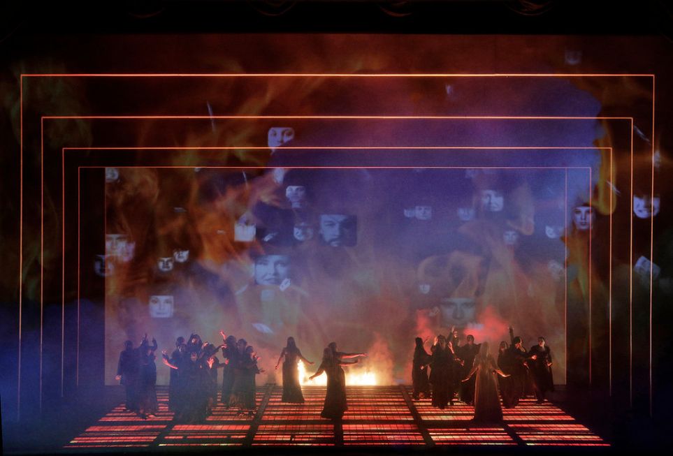 Continúa el ambiente de desolación ya observado en Siegfried. El pacto con la naturaleza se ha roto por completo, los bosques están muertos, los ríos secos y parece que no hay más líquido que la gasolina (y las pociones de Hagen). Por si el inerte paisaje fuera poco, las salas de los guibichungos son además un monumento al mal gusto, el frío metal complementado solo por horteras taburetes de piel de leopardo. Las nornas viven en el interior de un enorme centro de cálculo, detrás de una pantalla translúcida con la imagen de un chip gigante, y los hilos del destino son cables informáticos —incluso en los sobretítulos, la menos sutil de varias «traducciones libres», todas innecesarias en mi opinión—. La mejor escena es seguramente el lecho del Rin, en el que las ondinas, vestidas andrajosamente, se afanan en la fútil tarea de limpiar las ingentes cantidades de basura acumulada. Aquí, como en el Rheingold, el agua del río se evoca mediante densas nubes de vapor. Pero si en el prólogo los personajes estaban totalmente sumergidos en este vapor, en esta última jornada la densa niebla apenas les llega a las rodillas, lo cual sugiere elegantemente la desecación del río. Como en las anteriores óperas, los interludios orquestales están acompañados de atractivas proyecciones, que refuerzan el mensaje de degradación ecológica.