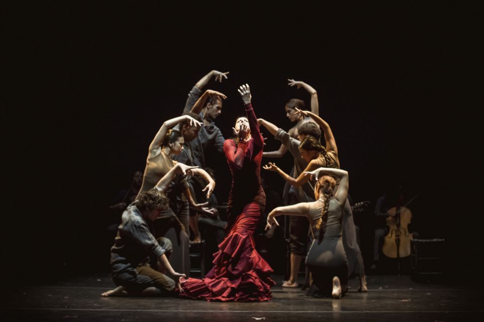 La lengua coréutica española aparece como vehículo de complicidad con el espectador. Aquella ancestral quironomía en las manos que rematan los cimbreantes brazos de María sabiamente transmitida a todas las mujeres de su compañía, la ballimaquía en los rotundos pies de los hombres, lo pírrico en la lucha y en el ritmo que abre el espectáculo a través de la percusión de los pies descalzos de los hombres y las mujeres, porque nos encontramos ante mujeres y hombres que bailan y danzan dentro de nuestros más genuinos códigos coreicos y musicales, en total simbiosis con los músicos instrumentistas y vocales que otorgan ese valor de espectáculo integral vivo que siempre agradecemos.