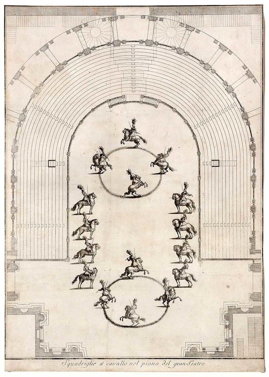 En la ciudad de Parma, cuna de la reina madre Isabel de Farnesio, la tradición ecuestre tenía solera de siglos. En el Teatro Farnese de Parma fueron abundantes los ballets ecuestres. En tanto que adelanto sobre los antecedentes inmediatos al fenómeno español, hemos de recordar que Carlos fué Duque de Parma entre los años 1731 y 1735 (justo antes de acceder al trono de Nápoles).