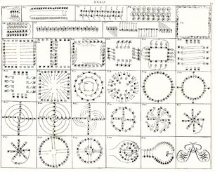 Los desplazamientos espaciales de los conjuntos coreográficos, generamente organizados en fila simple, fila de parejas o de cuartetos, han sido tradicionalmente escritas de diversos modos, siempre relacionados con la escritura coreográfica del desplazamiento en danza, muy extendida durante todo el siglo XVIII y XIX mediante diviersos sistemas, muy similares unos a otros.