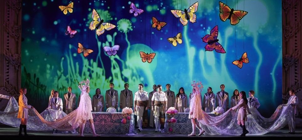 Visualmente llenas de belleza y color, las enormes mariposas que «descienden» sobre el escenario no responden a ningún motivo lógico. La acción tiene lugar en una escena que nunca cambia: hay un gran cabinete de laboratorio científico –con al interior una colección disparatada de objetos, desde alambiques y partes anatómicas hasta dos maniquís con los bustos ortopédicos de Frida Kalho y unas pequeñas reproducciones de pinturas suyas–, cuyas puertas abiertas o cerradas producen un juego de espejos que quiere contribuir al sentido de simulación. En el escenario, dos largas mesas y unos almohadones, también decorados con mariposas, sustituyen todos los elementos que el relato preveía: la alcoba de las dos hermanas, el saloncito de recibir, el jardín en el que se reunen con «los albaneses». Sobre esos almohadones, las dos duermen, se desesperan, y se soplan en total seis botellas de vino o champán... Sólo la evidente juventud de los intérpretes puede volver vagamente aceptable la improbable ambientación estudiantil. Aparece en cambio incongruente (pero su voz ¡es excelente!) la no tan joven intérprete de Despina, Tracy Dahl, que recuerda a una nodriza de Shakespeare más que a la intraprendente y pícara criada de Mozart, la misma que contesta a Don Alfonso, cuando él le pide ayuda: «A una muchacha/Un viejo como usted no puede darle nada». Pero la misma soprano es perfecta en el papel de falso médico o en la toga de notario...