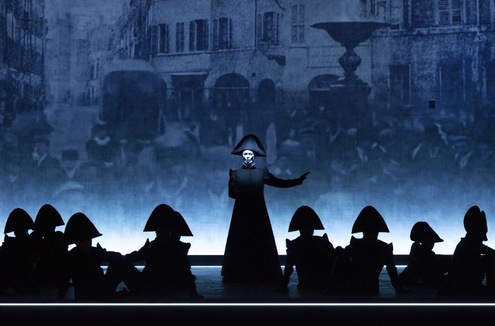 Acertado el estilizado vestuario predominantemente negro, exaltado por la visión en contraluz de figurantes con rígidas siluetas alineadas, tocados napoleónicos y manos en ademán de friso egipcio. A la misma estética y coreografía se atienen casi siempre los demás personajes y figurantes, con la consecuencia de que no se pueden juzgar las calidades dramáticas de unos cantantes obligados a posturas estáticas con contados movimientos mecánicos. Ninguna emoción puede emanar de sus rostros hieráticos. Los últimos encuentros entre los enamorados y entre madre e hijo tienen lugar a metros de distancia, incluso cuando la muerte está apunto de separarlos para siempre.