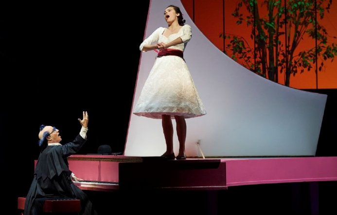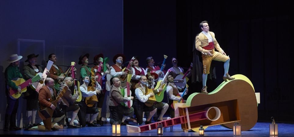 Este Barbero conserva de hecho el equipo artístico-técnico catalán [dirección, coreografía, vestuario, diseño de iluminación], el bosquejo general y los elementos escenográficos de 2015: la vivaz paleta de colores en objetos y vestuario; el ventanal al fondo con el arbolito, que cambian de luz y color según la atmósfera que se quiera crear; la enorme guitarra sobra la que el Conde de Almaviva se trepa para dar su serenata; el estilizado panorama vial al inicio del primer acto, una maqueta que gira luego sobre sí misma dando lugar al interior de casa de Don Bartolo, invariado hasta el final de la obra; el inmenso piano rosa de gran cola, utilizado de vez en vez como instrumento, como un altillo para que Figaro pueda por fin afeitar a Don Bartolo, come tarima de exhibición, y como mesa puesta para el festejo final; incluso la araña de la que se cuelga uno de los sirvientes-acróbatas, trabajosamente subida hasta el plafón para luego soltarla de repente, casi encima de los personajes reunidos sobre el piano (un detalle, éste de la lampara, que me parece totalmente desprovisto de utilidad o sentido escénicos, y me lo hubiera ahorrado sin problema).