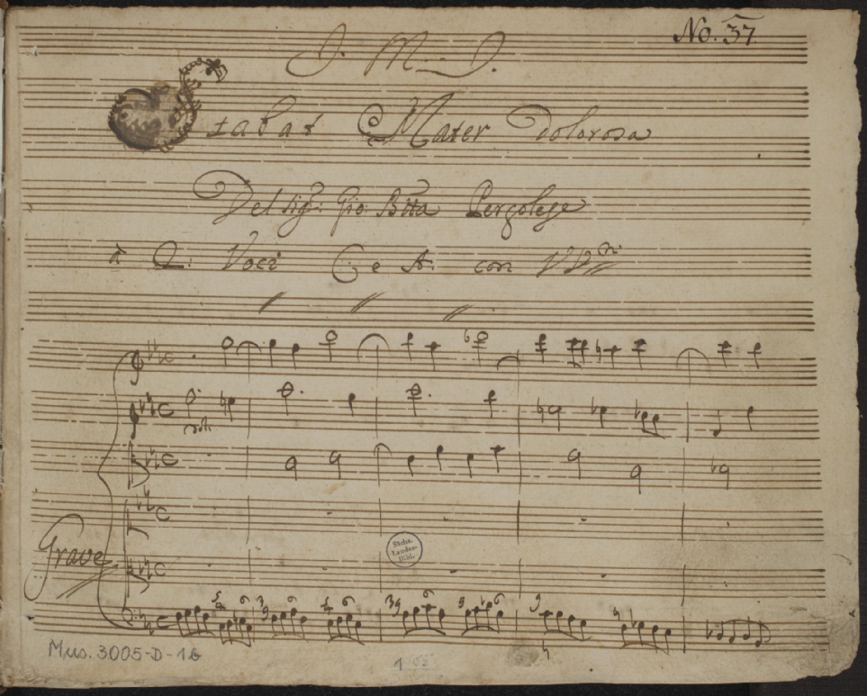 Inicio del manuscrito del Stabat Mater, de Giovanni Battista Pergolesi [c. 1736, Sächsische Landesbibliothek, Dresden].