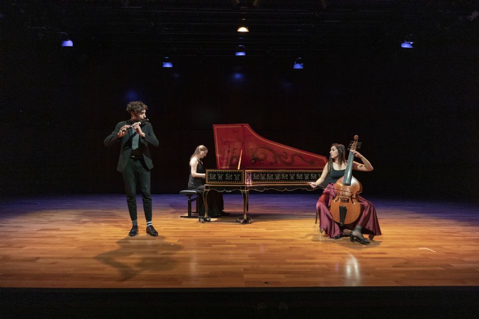 Regresando a Johann Sebastian, el concierto concluyó con un bloque de tres piezas, las dos primeras para instrumento solista, regresando el trío al completo en la segunda de ellas y en la obra final –ya con el protagonismo igualado–. Weronika Paine ofreció el Allegro de la Sonata para clave en re mayor, BWV 963, mostrando gran flexibilidad en la mano izquierda y una gran expresividad melódica, igualando los arpegios en importancia con esta, de tal forma que el planteamiento de la pieza cobra otra perspectiva. El exigente pasaje de escritura paralela entre ambas manos fue resuelto con firmeza, dando paso a una fuga levemente desajustada en el inicio del sujeto, dibujando el bajo con claridad y restando densidad al exigente contrapunto. El Andante de la Sonata para flauta en mi menor, BWV 1034 ofreció la oportunidad de mostrar a un Gigosos en plenitud, con un fraseo legato de suma elegancia, sostenido en pizzicato por la viola y con el clave en registro laúd. Tempo reposado, permitió al traverso desarrollar las notas largas con sutileza. Faltó únicamente algo de calidez en el acompañamiento al clave, un punto mecánico aquí.