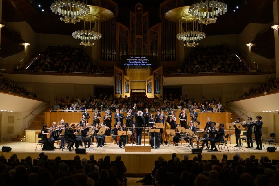 Pero es el Credo donde la filigrana coral adquiere toda su relevancia, con una sucesión de coros –toda la sección se conforma con escritura coral, salvo un aria para bajo y un dúo de soprano I y alto–. Desde el monumental «Credo in unum Deum» a 5 inicial –lamentando aquí una entrada y emisión en los bajos tan brusca y poco elegante, como inhabitual en ellos–, que aquí sorprende por el uso de un bajo casi caminante –impecablemente labrado por Emmanuel Balssa y Toru Yamamoto a lo violonchelos, pero sobre todo por el contrabajo de Robert Franenberg–. Lo mejor estaría por llegar: el triunvirato que constituyen «Et incarnatus est» a 5, «Crucifixus» a 4 y «Et resurrexit» a 5. El primero de ellos, construido sobre la base rítmica que marca su esencia, con firmeza, pero sin apresuramiento, en una dinámica media muy cómoda, con un sonido muy cuidado, sostenido por los punzantes arpegios de la cuerda. No rehuyeron las disonancias, al contrario, las sirvieron con convicción y crudeza, pero sin desvirtuar el color amable precedente. Enorme impacto, por lo demás, el logrado por las sopranos en las notas tenidas, muy bien desarrolladas. El coro central –puro stile antico– se construyó sobre un trabajo imitativo muy sólido, con el texto muy articulado sobre la escritura rítmica y un fraseo en arco que liberaba las entradas de cada línea con meridiana claridad. Lástima que el final –uno de los momentos de mayor impacto de esta obra–, que Bach indica para coro a cappella, no llegará con la filigrana necesaria, ni en el balance, ni en la claridad con que la cadencia se resuelve en la línea de sopranos. Fueron momentos en los que se pudo apreciar un trabajo retórico importante. El regreso a la luminosidad y la magnificencia llegó en el último de los tres, mostrando el enorme músculo de la agrupación. Muy interesante el contraste remarcado aquí entre la plenitud de las trompetas, con la finura expuesta por traversos y oboes. Concluyó el Credo con dos coros a 5, «Confiteor unum baptisma» y «Et expecto resurrectionem». El cantus firmus que utiliza en el primero fue resuelto con mayor sutileza en tenores que en unos bajos algo rudos. De nuevo, muy relevante la crudeza de las disonancias aquí. El útil escalonamiento de las diversas entradas en el coro final fue su mayor virtud.