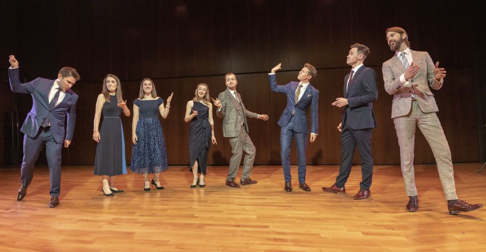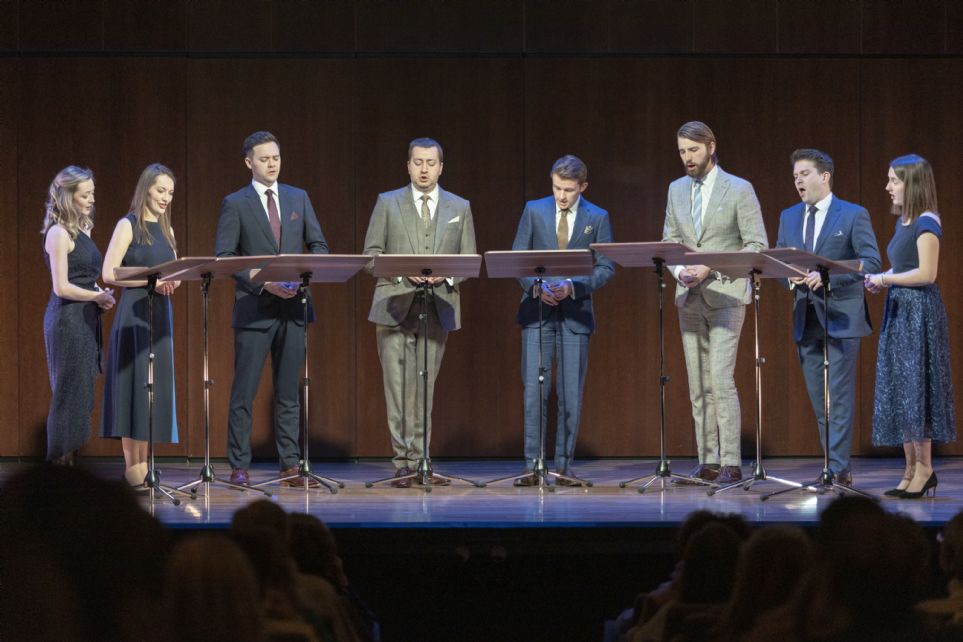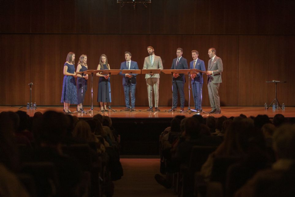 Madrid, 19-I-2022, Fundación Juan March. Polifonías, primer concierto del ciclo Reinterpretar los clásicos. Obras de Orlando Gibbons, Igor Stravinsky, Sergei Rachmanivov, Arvo Pärt, William Byrd, Thomas Weelkes, Benjamin Britten, Edvard Grieg, Philip Stopford, Thomas Tallis, Alec Roth, Maurice Duruflé, Ola Gjeilo y Rosana Panufnik. VOCES8: Eleonore Cockerham y Molly Noon [sopranos], Katie Jeffries-Harris [mezzosoprano], Barnaby Smith [contratenor], Blake Morgan y Euan Williamson, [tenores], Christopher Moore [barítono] y Jonathan Pacey [bajo].