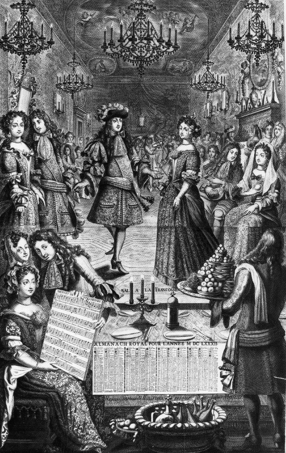 Menuet de Strasbourg, de Pierre Landry (1630-1701). Grabado de una baile en la corte de Louis XIV, aparecido en el Almanach royal [1682]. Quien aparece abajo a la izquierda, mostrando la partitura, es probablemente el propio Charpentier, autor de la música que se baila.