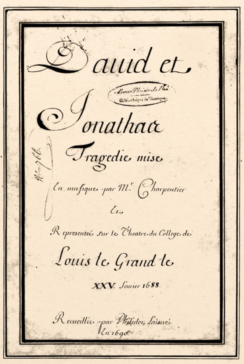 Frontispicio de la partitura manuscrita de David et Jonathas, recogida por André Danican Philidor [1690, BnF · Gallica].