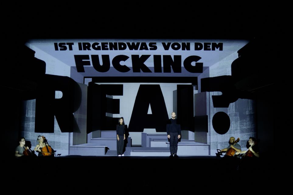 Lo primero que vimos al sentarnos en la butaca del coqueto teatro de la calle Fleischmarkt es el escenario prácticamente cerrado, con una cuenta atrás proyectada con números grandes en el telón posterior, y con dos grandes superficies rectangulares a los lados, iluminadas en blanco, negro y gris, donde posteriormente se verán los mensajes. En el centro del escenario seis personas de pie observan como termina la cuenta atrás. El efecto del blanco y negro tiene gancho desde antes de comenzar la música. Al llegar a cero, el sonido de un teletipo dispara el primer mensaje. Cuatro de los seis son los músicos que toman cada uno su violonchelo, se sitúan en las cuatro esquinas del escenario y comienzan a tocar, mientras los otros dos, los actores cantantes se ponen manos a la obra. A partir de ahí, la velocidad es endiablada. Las escenas se desarrollan y se interrumpen, mientras en el escenario se proyecta cuál de los seis testigos nos habla. No se ve al director musical que está en el piso superior del teatro junto al esquipo escénico. Marca los tiempos a los músicos de manera electrónica a través de pinganillos. Los cuatro violonchelos son el armazón musical sobre el que se desarrolla la obra. Primero suenan rápidos, acerados, con fuertes altibajos. Poco a poco se conjuntan más, como si nos encontráramos ante una gran obra para cuarteto de cuerdas –mejor dicho de violonchelos– con voces y grabaciones electrónicas. La obra es un gran crescendo hasta la entrada de la policía, donde el escenario, hasta ese momento casi vacío y donde solo se proyectaban efectos ópticos que cambiaban en cada micro escena, de repente se abre hasta el fondo dando una imagen de profundidad, aunque siempre con los tonos blancos, negros y grises. De hecho, la madera de los violonchelos es lo único que se sale de esos colores. La música crece y crece. Tiene algo que me recuerda a la locomotora de Pacific 231 de Arthur Honegger. Luego, la muerte y la desolación. Los violonchelos se tornan lánguidos y expresivos, con melodías cuasi barrocas para acompañar los lamentos finales del amigo y de la periodista.