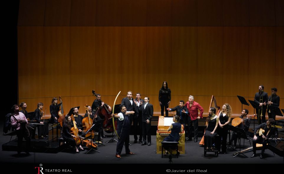 Más allá de un elenco vocal muy notable para esta obra plenamente coral, y dejando a un lado los recortes habituales llevados a cabo en estos casos, se hizo notar que la obra está recientemente editada –para su propio sello Gemelli Factory– y en gira, porque el engranaje encajó a la perfección y el nivel de excelencia general fue muy alto. Ayudó, por supuesto la atinada selección de voces, pero más si cabe la concepción muy expresiva y certera del aparato instrumental, que, sin llegar a la opulencia utilizada en la grabación, planteó una presencia del continuo riquísima en colores y defendida con magnificencia por los implicados. Clave, órgano positivo, tiorba, laúd, guitarra barroca, arpa triple, viola da gamba, lirone, bajo de violón, contrabajo y fagot hicieron de esta una memorable velada presencia de un continuo muy inteligente y efectivo –no sólo, porque algunos de ellos participaban también en los ritornelli y en arias como instrumentos melódicos–, cuyo planteamiento de los timbres y colores con intenciones retóricas funcionó excepcionalmente. Sobresaliente el concurso de todos ellos, aunque extraordinario resultó la actuación de varios de ellos, en tanto que sostuvieron el peso del drama en los recitativos y en otros muchos momentos. Cabe mencionarse, de esta forma, a toda la cuerda pulsada y al clave, por su capacidad de flexibilidad en el acompañamiento al canto, manteniendo la firmeza estructural, un exquisito manejo del color y una poderosa capacidad de evocar los diversos afectos del drama. Violaine Cochard fue una excepcional directora en ausencia de González Toro, dominando la escena desde el centro mismo, de tal forma que podía manejar con facilidad a los instrumentos de cuerda –violines y cuerda grave– de su izquierda, pero también a la cuerda pulsada y el viento de su derecha. Excepcionalmente flexible y evocador el sonido de Marie Domitille Murez en el arpa triple, junto a la guitarra barroca y tiorba del español Nacho Laguna y el laúd barroco de Vincent Fluckiger –uno de los mejores continuos que he escuchado al laúd en años, con un poderío sonoro y una solidez imponentes–. No es posible olvidar la labor exquisita y sutil de Louise Bouedo a la viola da gamba y el lirone, Gauthier Broutin al bajo de violón –que sostuvo buena parte del drama con su energía y un sonido cuidado al extremo–, el contrabajo de Jérémy Bruyère y el fagot barroco de Mélanie Flahaut. Excelente, por lo demás, el aporte de los instrumentos de viento, con Miguel Tantos Sevillano y Fabio di Cataldo en los sacabuches, además de Josué Meléndez y Matthijs Lunenburg manejando a las mil maravillas entre los cornetti y las flautas de pico. Compltaron la plantilla los muy solventes violines barrocos de Stéphanie Paulet y Margharita Pupulin.