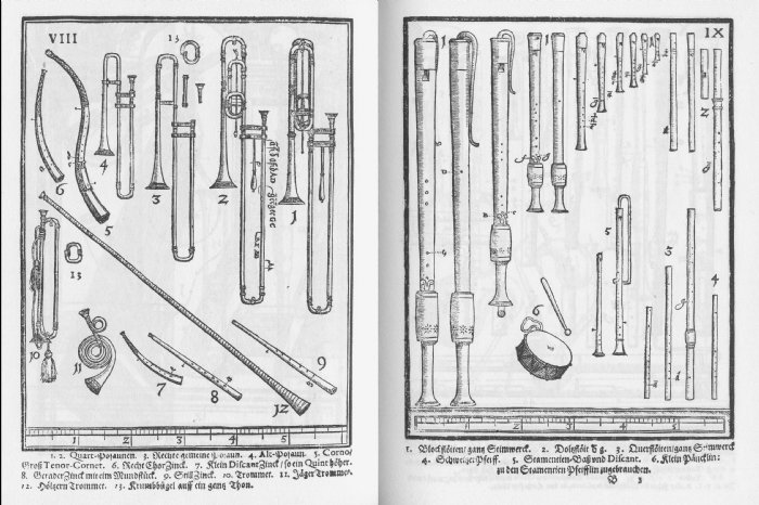 Dicho lo cual, la penúltima cita de uno de los ciclos estrella del CNDM, con la que se cerraba su presencia en la sala de cámara del Auditorio Nacional de Música –a falta del último concierto de su temporada, programado en la sinfónica–, logro al fin esa extraña sensación de enganchar al oyente por medio de la sorpresa. No era una apuesta arriesgada la del conjunto invitado, au contrarie, pues se trata de uno de los ensembles más legendarios de entre los que se dedican a la interpretación de la música temprana, Il Giardino Armonico [IGA], ensemble italiano fundado en Milano por su director, el flautista Giovanni Antonini. Lo que sí suponía una innovación importante, por lo que poco habitual en estos lares, era la formación con la que el conjunto acudía a esta cita, una auténtica banda de vientos renacentistas conformada por seis multinstrumentistas que presentaron un catálogo fascinante de instrumentos de lengüeta, bisel y boquilla: flauta de pico, traverso renacentista, cornetto, cromorno, chirimía, bombarda, bajón, bajoncillo y sacabuche [véanse en las imágenes algunos ejemplos plasmados en el apéndice Teatrum Instrumentorum (Wolfenbüttel, 1620), del libro II de Syntagma Musicum de Michael Preatorius], además de un órgano positivo –instrumento tan ligado, por otro lado, al viento–. Y debo admitir mi sorpresa ante la asistencia importante de público –que en algunos de los últimos conciertos estaba flaqueando–, si bien el nombre del conjunto atrae mucho, el repertorio desde luego no resulta un reclamo comercial potente. Pero ahí estaba, y a fe de las ovaciones al finalizar el concierto, se diría que el «respetable» disfrutó de la velada, algo que –vuelvo a tener que admitir– nunca hubiera imaginado. Quizá quede algo de esperanza…
