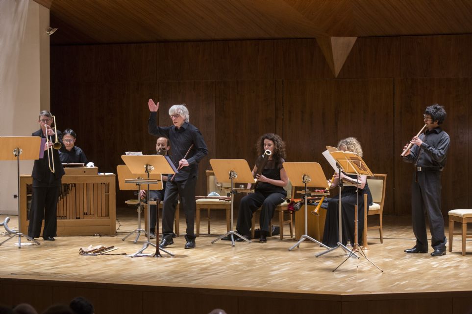 Priska Comploi tañó flautas de pico, chirimía y bombarda; Giulia Genini flautas, chirimías, bajones y bajoncillos; Andrea Inghisciano el cornetto –sus dos tipos rectos son el cornetto mutto y el cornetto diritto–; Carles Cristóbal hizo lo propios con bajones, bajoncillos cromorno y chirimía; mientras Emily White se encargó del sacabuche. El encargado del órgano positivo fue el japonés Takashi Watanabe. Por su parte, Antonini se puso al frente –literalmente– del ensemble pertrechado con flautas de pico y traversos de diversas tesituras. En general, magnífica desenvoltura de todos ellas en la velada, ya desde el inicio de la primera parte del concierto dedicada a los compositores previamente mencionados y que anteceden temporalmente a la saga Bassano. Antonini comenzó entrando flauta en mano mientras improvisaba un tema relacionado con «L’homme armé», canon a 4 [Canti B, Ottaviano Petrucci, 1502] y La Spagna a 5, las dos primeras obras del concierto, firmadas por el genial Josquin. La variedad de sonoridades, una afinación muy cuidada –fue posible escuchar con claridad en diversos momentos el batido de los acordes y los armónicos– y una comprensión muy interesante del repertorio permitieron mostrar lecturas en las que la filigrana, la solvencia de cada instrumentista y sus sonoridades tan particulares se pusieron al servicio de un bien mayor: el conjunto. No siempre se logró, sin embargo, un equilibro perfecto entre las líneas; especialmente problemático resultó el órgano, cuya sonoridad estuvo ausente en algunas piezas y momentos concretos. Muy bien definido el planteamiento contrapuntístico en La my [manuscrito de Henry VIII] de Isaac, iniciando el cornetto el salto interválico inicial que describe el título de la pieza, continuado después en imitación por otros instrumentos, destacando el poderoso, aunque elegante, cantus firmus dibujado por el cromorno. Magníficamente destacadas las profsusas ornamentaciones en «De tous bien plaine» [Harmonice musices Odhecaton A, O. Petrucci, 1501] de Ghizeghem, con flauta y cornetto elaborando un brillante diálogo melódico-rítmico de enorme solvencia, sostenidos por las notas tenidas de los instrumentos graves.