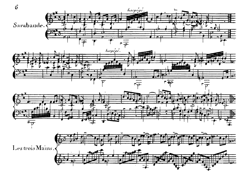 Sarabande e inicio de Les trois Mains, en la colección Nouvelles Suites de Pièces de Clavecin de Jean-Philippe Rameau [Paris, Paris Chez L'Auteur, Le Sr Boivin, Le Sr Leclerc; 1729/30].