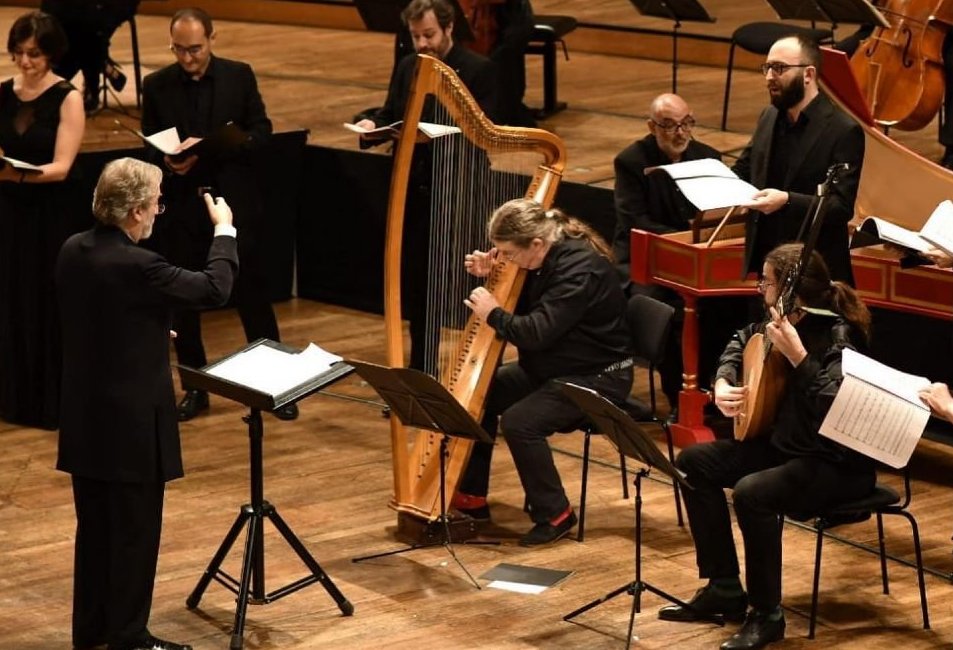 La segunda parte mantuvo un tono algo más alegre. Tuvimos dos madrigales de Claudio Monterverdi, ambos del 8º libro –«Altri canti di Marte» con texto de Giovanni Battista Marino, y «Hor che’l ciel e la terra» de Francesco Petrarca- introducidos ambos por dos pequeñas sinfonías a 5 y a 6. Aunque el título del libro es Madrigales de guerreros y amorosos, hay mucho más de lo segundo. Terminamos con dos de los últimos números de sus Vísperas de la beata Virgen. En el primero de ellos, la Sonata sopra «Sancta Maria, ora pro nobis», Savall tiró del efecto de subir a las 4 voces femeninas al balcón del coro. Su imagen en alto, y la buena interpretación de todas ellas, le dio un fuerte impulso al concierto de cara al número final, el famoso «Ave maria stella» donde ya se juntaron todo el ensemble en el escenario: 13 instrumentistas y otros 13 cantantes.