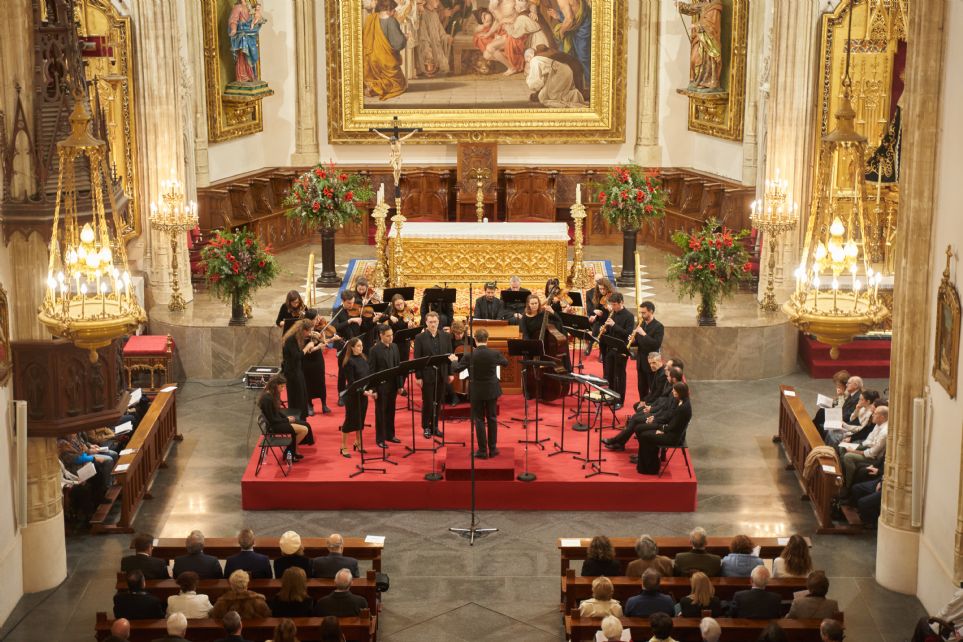 Los ocho responsorios presentan requerimientos interpretativos distintos, lo que hace que su interpretación uno tras otro y en orden aporte per se una notable variedad. Se ofrecieron, además, sin aplausos entre ellos –a pesar de que no se indicó nada al respecto al inicio de concierto–. Comenzó la velada con el Responsorio I: «Hodie nobis caelorum Rex» [Hoy para nosotros el Rey de los cielos], prescrito para un tutti enérgico, marcado por la presencia de los metales. Es necesario comentar lo problemática que es la acústica de San Jerónimo el Real, de tal forma que salvo las primeras filas, el sonido no llega al escuchante con la nitidez que requiere un contrapunto de esta índole. Lástima, porque al final, ¿qué es más conveniente, interpretarlo en el mismo lugar dónde se estrenó la obra, por una razón casi más romántica que otra cosa, o intentar que la experiencia auditiva sea lo más favorable posible para el público? Para mí la respuesta es clara. Decía, pues, que la acústica no favoreció –ni siquiera en una fila relativamente cercana, donde me encontraba– el entendimiento de muchos diálogos y el entramado de líneas orquestales, convirtiendo a los metales –muy cumplidores a lo largo de toda la velada los clarines de Gabriele Cassone y César Navarro, así como las trompas de Gilbert Camí Farràs y Pepe Reche– en una especie de sonido ambiente. Hizo falta un trabajo mayor para clarificar las articulaciones, especialmente en el tutti, evitando así parte de la pastosidad provocada por la acústica. El tratamiento alternante llevado a cabo por Nebra –tanto en textura, como en modos y en el diálogo ente coros– llegó plasmado con notable eficiencia, destacando especialmente la solidez en las entradas de ambos coros y sobre todo el juego pregunta-respuesta entre ambos, por más que el empaque sonoro del coro I fue siempre mayor que el del coro II –el balance entre ambos fue un problema general durante todo el concierto–. Faltó, asimismo, mayor presencia en las líneas de altos de ambos coros, pero también de la soprano III, esto es, la soprano del coro II. Tras el coro notablemente retórico coro «Gaudet exercitus Angelorum» [Se regocija la milicia angélica], llegó el primer versículo «Gloria in excelsis Deo» [Gloria a Dios en las alturas], una cuasi pastorale marcada por un contrapunto notable muy bien reflejado por ambas sopranos del coro I [Raquel Mendes e Irene Mas Salom], reforzada por la escritura de las cuerdas y oboes –magnífico trabajo aquí de Rodrigo Gutiérrez y Aviad Gershoni a los obos barrocos–. Misma línea en el versiículo «Gloria, patri et filio», antes de regresar a la repetición de la última estrofa de la respuesta [R’] para concluir.