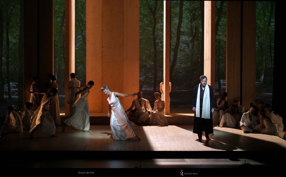 Regresaban Sasha Waltz y su compañía a las tablas del Teatro Real tras ofrecer, en 2019, un Dido & Æneas de Purcell con escaso impacto para el que firma, y lo hacían con el que está considerado como el primer gran drama escénico de la historia, firmado por Il divino Claudio. Qué bien lo hizo el cremonés, pues pasados generosamente los cuatro siglos de existencia, su presencia e interés en intérpretes y público sigue tan absolutamente vigente. Y qué difícil senda la que planteó, que apenas uno logra encontrar una o dos versiones plenamente satisfactorias de entre las cientos que han existen –cabe acordarse de la maravillosa propuesta en directo llevada a cabo por Les Arts Florisants en los Teatros del Canal, allá por 2017–. Lo que Waltz propone no está exento de cierto hipnotismo, un planteamiento de ópera coreográfica que le hace sentirse a uno incapaz de poder abordar una crítica global, dado que contiene una parte de danza muy sustanciosa que no puedo valorar con conocimiento. Sea como fuere, el minimalismo planteado para la escena, con una escenografía a cargo de Alexander Schwarz muy útil y normalmente efectiva, al menos con una concordancia con la historia suficientemente razonable como para no resultar ajena, no enturbió el planteamiento musical, quizá no tanto como si pudo hacerlo el corográfico en varios momentos. En ópera, como en cualquier otra propuesta escénica, el tener demasiados focos de atención consigue precisamente el efecto contrario, de tal forma que en varios momentos no se logra centrar la atención en lo que importa, sencillamente porque es difícil gestionar los niveles de relevancia de lo que se propone. Los dos mundos protagonistas del drama –el de los vivos y el inframundo– son definidos por detalles muy efectivos, destacando el diseño de vídeo de Tapio Snellman, que con escenas casi estáticas y en tonalidades plúmbeas logra un impacto visual poderoso, que juega de forma muy inteligente con la realidad de los personajes, que se internan muy bien en la imagen, a veces casi hasta difuminar qué es y no real –el aprovechamiento del espacio, tomando buena parte del escenario muchos metros hacia bastidores, logró aportar una enorme profundidad escénica–. A esto ayudó en buena medida una bastante sutil, pero muy lograda iluminación a cargo de Martin Hauk, especialmente impactante en los actos III y IV. Por su parte, el diseño de vestuario de Bernd Skodzig, de notable simplicidad, aunque no por ello falto de elegancia, tiene un gran poder de concreción, tanto en sendos mundos como en la definición de los personajes. Especialmente envolvente en lo visual resulta el acto I del drama, con aparentes referencias al universo de los prerrafaelitas. Por último, los elementos de atrezzo se limitan a unas pocas referencias a la naturaleza y fertilidad [flores], elementos conocidos de antiguas danzas festivas griegas [pañuelos] y algunos elementos básicos para personajes concretos [una vara como remo para Caronte].