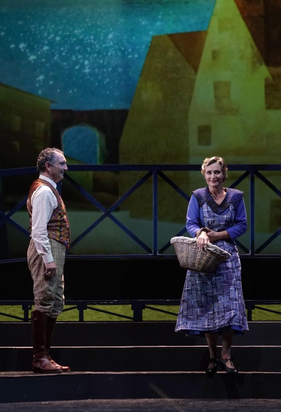 La verdad, uno no entiende el significado de los dos horribles andamios o brazos de grúa de color rojo y azul que junto a las proyecciones son las base de la escenografía. Quizás insisten en subrayar, como las primeras imágenes que se proyectan, en el carácter costero-portuario de la innombrada aldea de Provenza en que transcurre la obra, pero estamos ante un poblado de pescadores donde es complicado encuadrar un puerto con semejantes grúas. En fin, escasas ideas y un movimiento escénico somero, poco trabajado, con homenaje también. es de suponer, a las admirables compañías de zarzuela de toda la vida mediante el balanceo y bailecito de “la marcha de la amistad”. El montaje resulta eficaz, desde luego, para narrar la trama con claridad mediante unos diálogos parcialmente recortados, pero manteniéndose los suficientes para seguir adecuadamente el desarrollo teatral de la obra en un total de 100 minutos sin descansos. Desde luego, no es poco y se dirá que casa con el espíritu de «simpleza» e inmediatez que suele asociarse con Jacinto Guerrero y su obra, pero uno esperaba más.