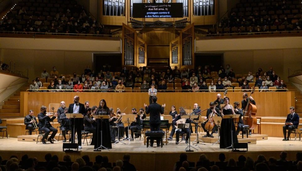 Con semejantes fuerzas orquestales, la presión sobre los solistas vocales a la hora de plantear su participación subió de forma exponencial, por lo que debían rendir a un nivel más que notable para no descalabrarse –lo normal no es que la orquesta brille más que los solistas, aunque últimamente pasa con cierta frecuencia con algunas agrupaciones de primer orden, dada la mediocre elección del elenco–. Hay que alabar en este sentido el ímpetu y la convicción de los cuatro cantantes al abordar sus respectivos roles. Comencemos por el contratenor catalán Xavier Sabata, uno de los falsetistas más consolidados en el panorama internacional del canto histórico en la ópera, que tenía ante sí un reto importante, con un papel dramáticamente potente y con numerosas arias de calado. Una de las grandes virtudes de Sabata es su presencia escénica, dada su formación actoral además de la canora, lo que favorece que sus roles sean siempre muy verosímiles, incluso en versiones en concierto, como fue el caso. Además, es un cantante de saborear el texto, que en su vocalidad alcanza siempre cotas de dicción y expresión muy elevadas. Posee una proyección importante para una tipología vocal que no siempre logra llenar salas grandes ni elevarse sobre la orquesta; Sabata lo hace. A veces hizo gala de un excesivo vibrato [«Notte, amica dei riposi»], incluso tuvo algunos problemas para encajar las agilidades con la orquesta en ese aria inicial, lo que subsanó en otros momentos que exigían una gran sincronía [«Vado, corro al mio tesoro»]. Muy potente dramáticamente en «Minacciami, non ho timor», en un trabajo homorrítmico muy bien gestionado junto a la cuerda y especialmente con un continuo magnífico en estas lides, mostrando además una muy notable homogeneidad vocal entre los registros de pecho y cabeza. Logró describir muy bien el ambiente pastoral de «Sussurrate, onde vezzose», con una sutileza acusada, acompañado muy bien por una intro exquisita del archilaúd, sumándose con corrección en el aria las flautas de pico de Sara Paré y Carles Vallès –algo tensas en el registro agudo–, en un momento muy íntimo, con la cuerda reducida para aportar ese carácter. Muy destacable aquí el color y la presencia ofrecida por las violas barrocas de Natan Paruzel y Núria Pujolràs. Algo mecánico en su coloratura Sabata, el unísono entre violines y flautas pudo encontrar también un mejor acomodo. En «T’amai, quant’il mio cor» estuvo muy inteligente para mantener un discurso fluido en esta aria multipartita de tanta variedad expresiva, que exige del solista tanto una bravura importante en algunos pasajes como un contraste y verosímil lirismo en otros. La última de sus arias [«Sento la gioia»] requiere de una bravura sin excesos, bien comprendida en carácter por Sabata, acompañado por trompeta y oboes algo inestables por momentos. En sendos dúos en los que participó [«Crudel, tu non farai», compartido con Melissa, y «Cangia al fine il tuo rigore», junto a Oriana] supo imbricarse con sutileza en el discurso de sus colegas, con una afinación y un equilibrio de fuerzas bien concebido, empastando con cierta solvencia a pesar de las vocalidades tan distantes que presenta con ambas cantantes, conectando escénicamente con notable resultado expresivo.