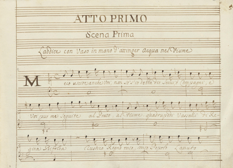 Inicio del acto I de Il Mitridate Eupatore, en la versión de Alessandro Scarlatti [copista veneciano, c. 1707/15, Staatsbibliothek zu Berlin].