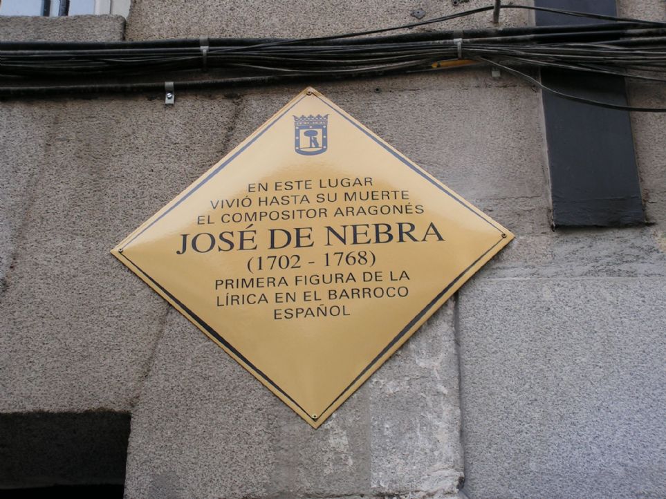Placa conmemorativa dedicada por el Ayto. de Madrid al lugar donde residió el compositor José de Nebra durante su vida en madrid, sita en la Plaza del Ángel, 11.