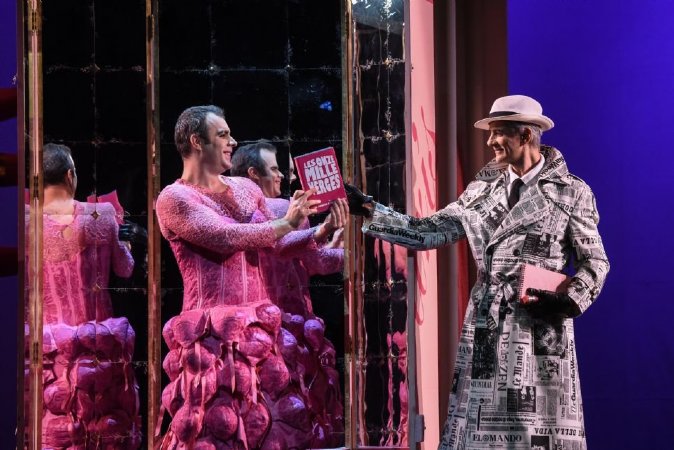 Como subrayaba más arriba, la eclosión surrealista y disparatado mosaico en el que emerge exultante el entusiasmo y alegría de vivir de Los pechos de Tirésias parece atraer más el interés de Emilio Sagi y resulta un vehículo más adecuado para su fantasía y creatividad. En una progresión colorista, del gris inicial hasta un rosa que se va imponiendo poco a poco, el espectador aprecia la disparatada progresión de escenas en un escenario a dos niveles cada vez más poblado y en el que la acción y el dinamismo no decaen hasta culminar en la explosión final con ensueño Drag y luces de Boîte en sala incluidas.