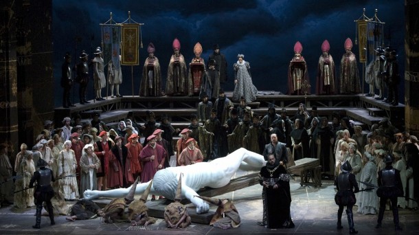 La ópera narra, basándose sobre todo en el drama homónimo de Friedrich Schiller, la relación amorosa entre D. Carlos, infante de España, y heredero de Felipe II, con la tercera esposa de éste, Isabel de Valois. Ya explicamos en dos amplios artículos en Codalario (enlace aquí y aquí) que poco tenía que ver la realidad histórica con lo narrado en la obra verdiana. Eso no le quita un ápice de grandeza, porque lo que Verdi nos cuenta es una gran historia de amor, no, corrijo, varias historias de amor. Está, por un lado, el amor central, el de Isabel y Carlos, pero también se muestra el amor de Felipe por Isabel y la soledad y la pena que siente por no ser correspondido, dibujada musicalmente por Verdi en uno de los más memorables momentos de la ópera: Elle n’aime pas. También otra de las protagonistas, la Princesa de Éboli, está enamorada de Carlos y al verse rechazada por el Infante su venganza dará argumentos al rey para castigar el incestuoso amor de su hijo por su esposa. Amor, fraternal si se quiere, pero amor al fin y al cabo, también es el que siente el Marqués de Posa, defensor de los rebeldes flamencos, por su amigo Carlos. Todas estas relaciones quedan enmarcadas por una España presentada como intolerante y fanática, represora del anhelo de libertad de las tierras de Flandes y que, bajo el implacable yugo de la Iglesia personificada en el Gran Inquisidor, no perdona ni entiende de libertad.
