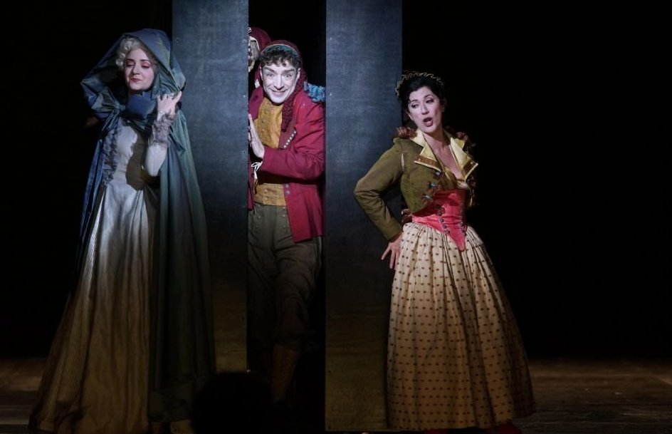La puesta en escena de Sanzol apenas se salva por cierta eficacia del movimiento escénico y, sobre todo, por la belleza, adecuación y colorido del vestuario de Alejandro Andújar, que también firma una escenografía desnuda y definitivamente fallida, basada en unos rudimentarios paneles negros que deben mover los propios artistas de forma tosca y ruidosa y que, como ya subrayé en la reseña del 2019, lo mismo (mal) valdrían para una puesta en escena de La alsaciana, de El cazador furtivo, Las bravías, El conde de Luxemburgo o de Cinco minutos nada menos. El montaje incide en la parodia de la autoridad representada por una Guardia valona particularmente torpona y despistada y permite, eso sí, que los artistas canten en la parte delantera del escenario, además de beneficiarse de una correcta coreografía de Antonio Ruz y buena iluminación de Pedro Yagüe.